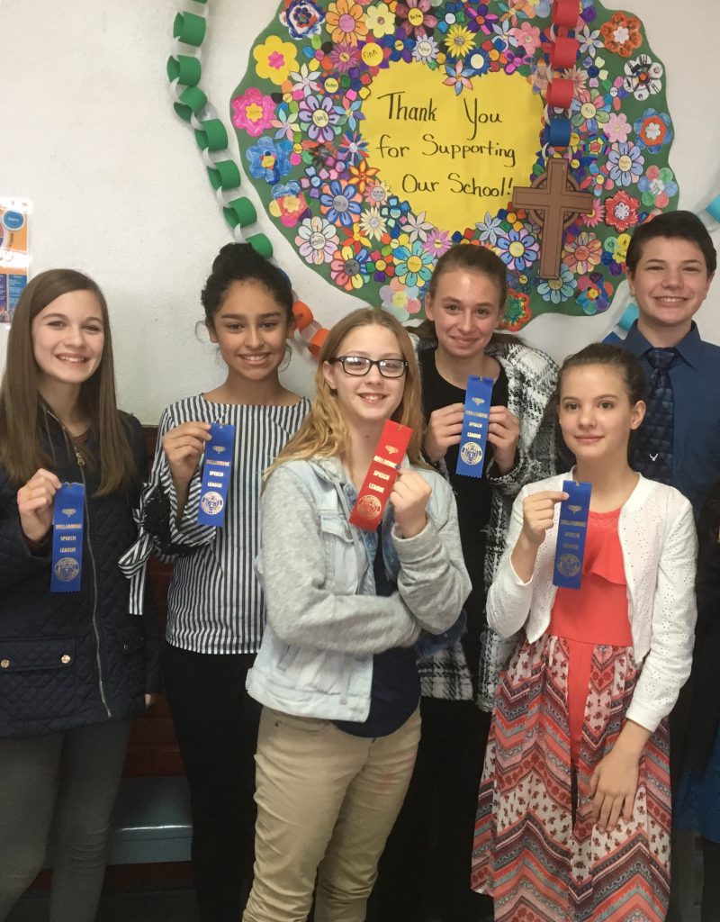 The Sacred Heart Jr. High Speech team participated at the Bellarmine Speech Contest on Saturday, Jan. 26, in Glasgow, MO, earning four blue ribbons (highest awarded) and one red (second-highest awarded).