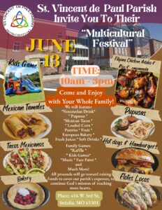 You are warmly invited to the St. Vincent de Paul Multicultural Festival on Saturday, June 13, from 10:00 AM to 3:00 PM. Enjoy a day filled with culture, music, and fellowship, along with a variety of delicious traditional foods available for purchase, lovingly prepared by members of our community. Bring your family and friends and join us for this special celebration—all proceeds will support our parish. We look forward to seeing you! God bless.